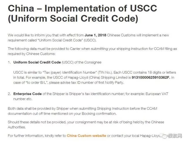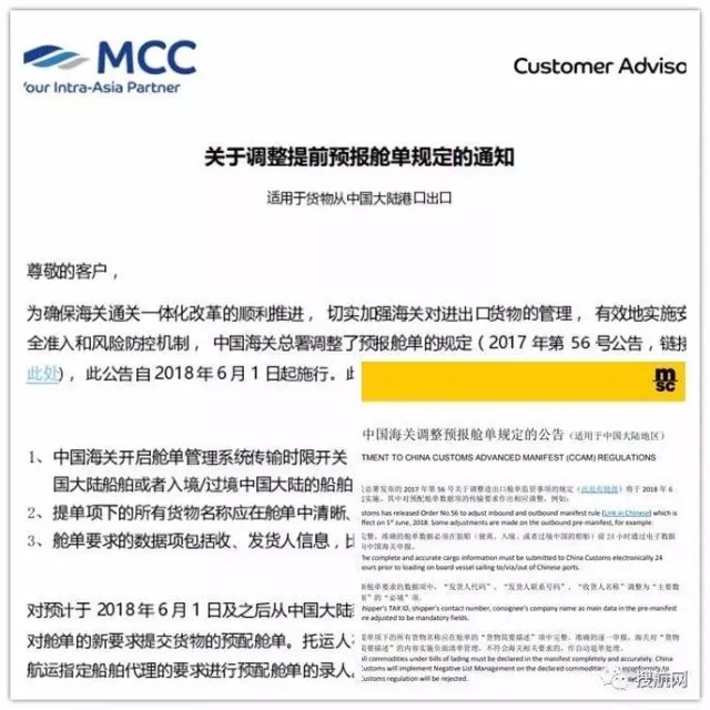 For goods scheduled to be shipped from the Chinese mainland for export on or after June 1, 2018, the shipping company will submit preloaded manifest in compliance with the new requirements of the Chinese customs for manifest.